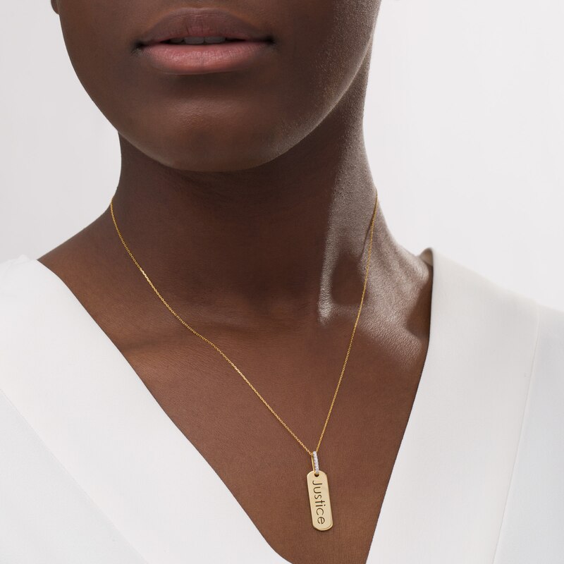 Wear your values with pride with this statement-making diamond pendant from the Wonder Woman Collection. Crafted in warm 10K gold, this petite tag features the word "Justice" inscribed vertically along the center. Diamonds line the bail for a hint of sparkle. Captivating with 1/20 ct. t.w. of diamonds and a bright polished shine, this pendant suspends along a 16.0-inch cable chain with 2.0-inch extender that secures with a spring-ring clasp. The Wonder Woman Collection of fine jewelry at Zales is inspired by one of the most beloved and iconic DC Super Heroes of all time. Embodying strength and grace, Wonder Woman is a modern-day warrior. This exclusive fine jewelry collection inspires you to wear your strength, confidence and power.