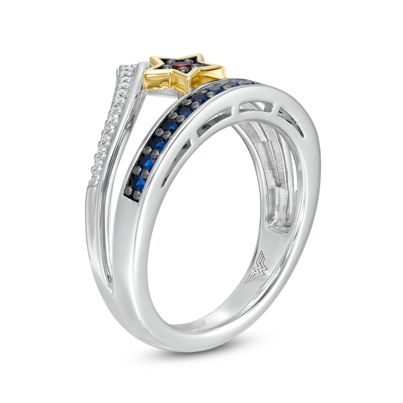 Embrace your inner princess and your inner warrior with this stunning gemstone and diamond ring from the Wonder Woman Collection. Fashioned in sterling silver, this open-worked style features a regal red garnet set in a 10K yellow gold star. Highlighting the center, a row of bright blue sapphires and a chevron-shaped ribbon of diamonds create a tiara-like look. Captivating with 1/15 ct. t.w. of diamonds and a brilliant buffed luster, this choice is an epic twist on a modern design. This ring is available in size 7 only. Sterling silver rings cannot be resized after purchase. The Wonder Woman Collection of fine jewelry at Zales is inspired by one of the most beloved and iconic DC Super Heroes of all time. Embodying strength and grace, Wonder Woman is a modern-day warrior. This exclusive fine jewelry collection inspires you to wear your strength, confidence and power.
