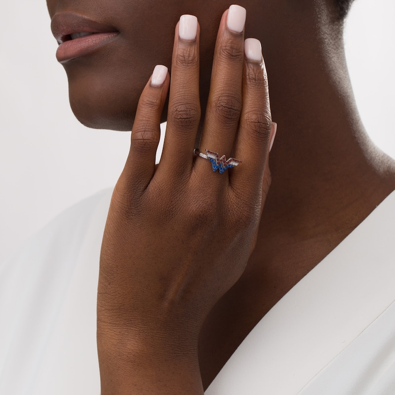 Bursting with action from the Wonder Woman Collection, this gemstone and diamond ring brings eye-catching color to your fearless style. Crafted in sterling silver, this look showcases the "WW" logo lined in regal red garnets, bright blue sapphires and sparkling diamonds. Diamonds adorn the shank for an extra hint of shimmer. Captivating with 1/15 ct. t.w. of diamonds and a brilliant buffed luster, this design makes a bold statement. This ring is available in size 7 only. Sterling silver rings cannot be resized after purchase. The Wonder Woman Collection of fine jewelry at Zales is inspired by one of the most beloved and iconic DC Super Heroes of all time. Embodying strength and grace, Wonder Woman is a modern-day warrior. This exclusive fine jewelry collection inspires you to wear your strength, confidence and power.