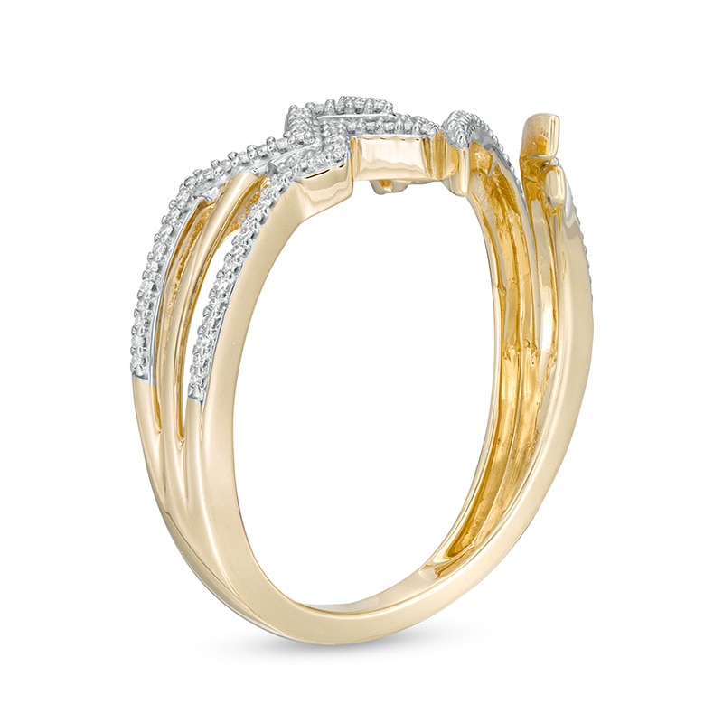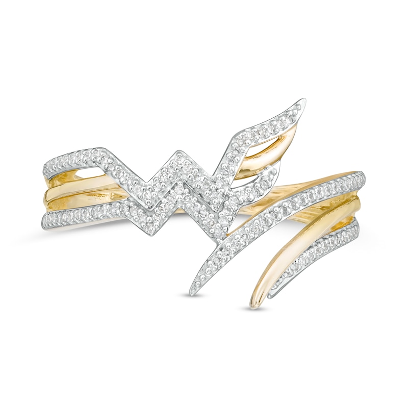 A modern take on the classic symbol, this diamond ring from the Wonder Woman Collection is for the uniquely bold. Fashioned in warm 10K gold, this split-shank style features curved polished and diamond-lined ribbons in a clever bypass design. The "WW" logo shines along one side. Radiant with 1/8 ct. t.w. of diamonds and a brilliant buffed luster, this ring is meant to be yours. The Wonder Woman Collection of fine jewelry at Zales is inspired by one of the most beloved and iconic DC Super Heroes of all time. Embodying strength and grace, Wonder Woman is a modern-day warrior. This exclusive fine jewelry collection inspires you to wear your strength, confidence and power.